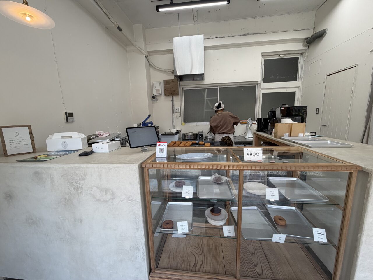 お店の方にお話を伺ったところ、ドーナツは味が6種類(プレーン、きなこ、チョコ、シナモン、シュガー、ココア)で、おとうふと豆乳で作った優しい味に仕上げているそうです。シンプルな店内に、銀のトレーが学校の給食みたいで懐かしい感じもしますね。