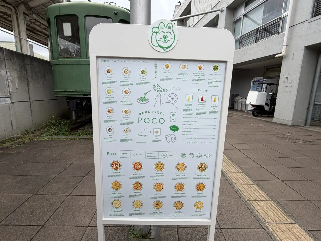 招き猫が目印のメニュー看板がありました。可愛いですね。BARE PIZZA POCOのインスタグラムによるとすぐ近くにある豪徳寺は招き猫発祥の地。そのご縁にちなんで、お店のマスコットをピザを招く猫にしたそうです。